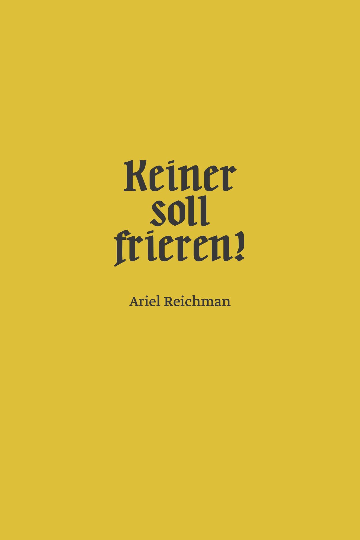 This exhibition catalog presents a selection of over eighty new works by Reichman. It contains a preface by Nils-Arne Kässens, an essay on the exhibition by the curator Mechthild Achelwilm, a contribution by Thorsten Heese on the Winter Relief of the German People, and a conversation between Sebastian Baden and the artist.
