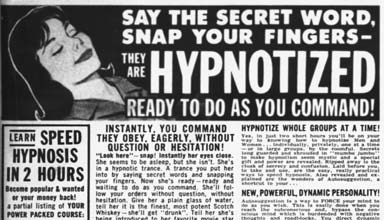 The ad promised that a mastery of hypnotism would enable me to control the minds of others, particularly the minds, and indeed the hearts, if not some other parts, of girls: “‘Look here’—Snap! Instantly her eyes close. She seems to be asleep but she isn’t. She’s in a hypnotic trance. A trance you put her into by saying secret words and snapping your fingers. Now she’s ready—ready and waiting to do as you command. She’ll follow your orders without question or hesitation. You’ll have her believing anything you suggest and doing whatever you want her to do. You’ ll be in control of her emotions: love, hate, laughter, tears, happy, sad. She’ ll be as putty in your hands.”