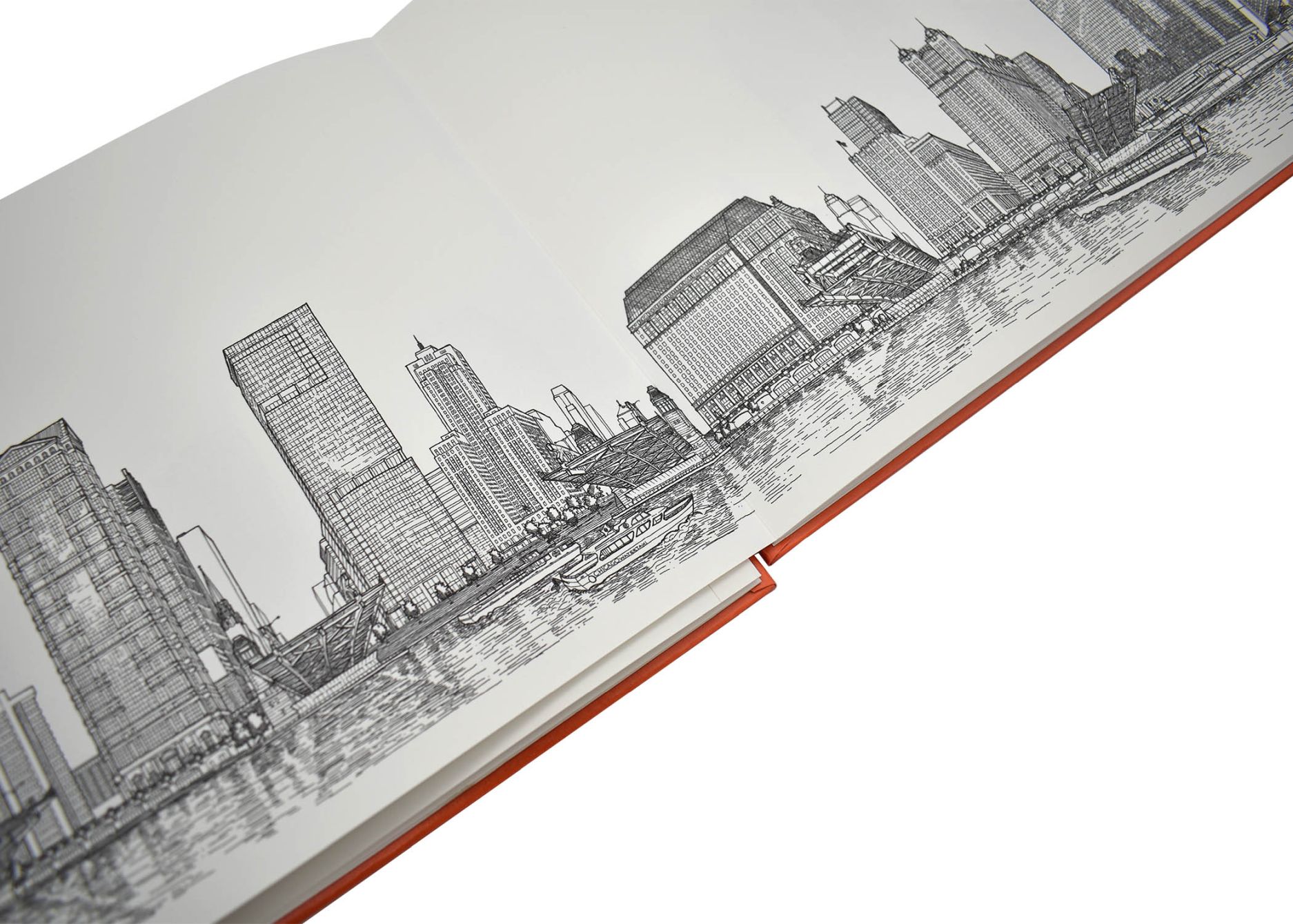 A unique and playful hand-drawn exploration of the Chicago River’s landscape, documented on an eleven-foot-long foldout.